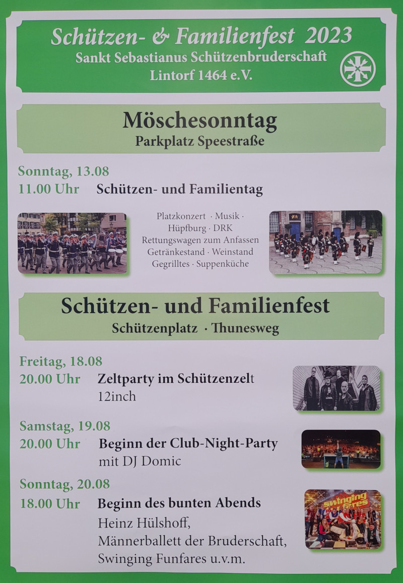 Eine wichtige Information dabei für alle Lintorfer: Möschesonntag findet im Dorf statt und nicht auf dem Schützenplatz. „Wir sind Bruderschaft“ lautet das Motto der Lintorfer Bruderschaft. Mit „wir“ sind alle Lintorfer gemeint. Deshalb rückt die Bruderschaft mit dem Möschesonntag auch wieder näher an die Lintorfer heran, nämlich Mitten ins Dorf. Viele erinnern sich noch zu gerne an die schönen Stunden, als die Bruderschaft Möschesonntag noch vor Haus Anna feierte.