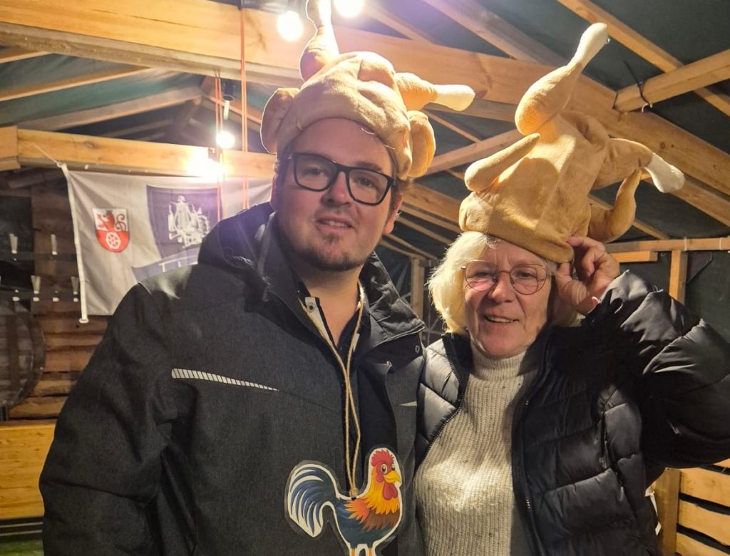 Nach einem zünftigen Essen begann der Höhepunkt des Abends – der traditionelle Wettkampf um die Hahnenkönigswürde. Der „Hahn“ – in diesem Fall ein unerschrockenes Exemplar aus Gummi – wurde feierlich aufgehängt, und die Spielleute traten nacheinander an. Mit verbundenen Augen und einem stumpfen Säbel galt es, das tapfere Federvieh zu „erlegen“.