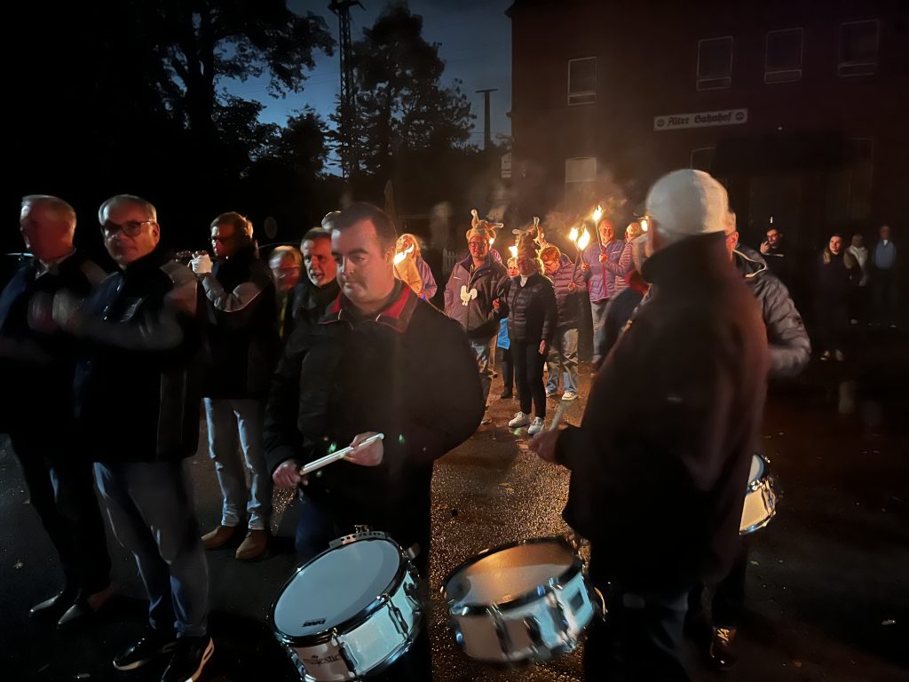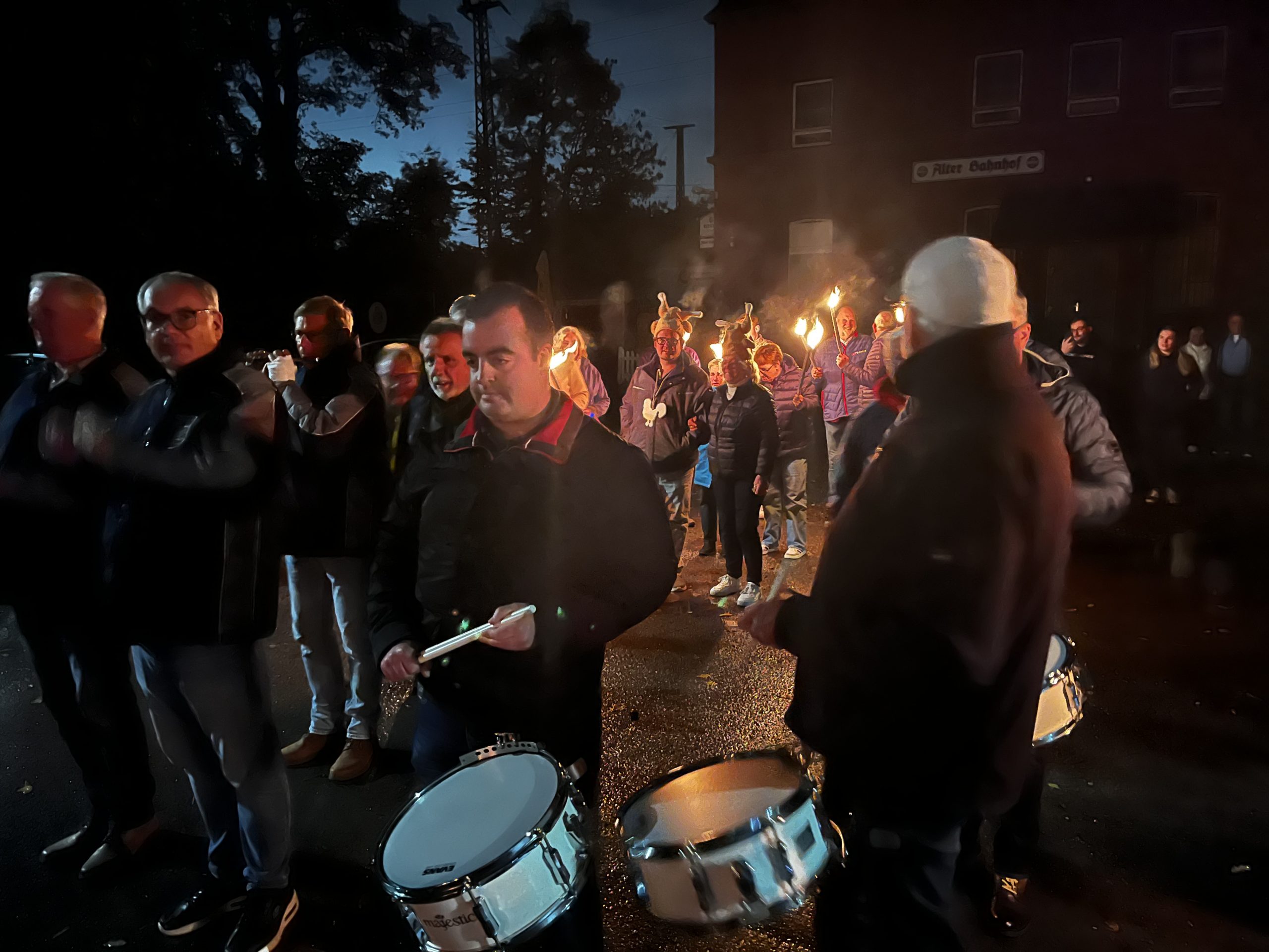 Das Wetter zeigte sich an diesem Abend leider von seiner nassen Seite, sodass der anschließende Fackelumzug kurzerhand etwas verkürzt werden musste. Doch echte Spielleute lassen sich davon nicht die Stimmung verderben – im Gegenteil! Mit dem Lied „Freut euch des Lebens“ an der Spitze zog der bunte Zug durch Teile von Lintorf und brachte auch einige Zuschauer am Straßenrand zum Schmunzeln.