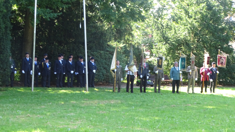 Begonnen hatte der Tag für die Schützen auf dem Marktplatz im Schatten von St. Anna. Von dort waren sie zum Ehrenmal auf der Drupnas gezogen, um für die im vergangenen Schützenjahr verstorbenen Bruderschaftsmitglieder einen Kranz niederzulegen: Hans-Wille Küpper (Andreas-Hofer-Korps) und Alfons Sobkowiak (Stammkorps). Außerdem gedachten die Schützen Gero Keusen, dem überraschend verstorbenen Ratinger Schützenchef. Er war ein guter Freund der Lintorfer Bruderschaft. Schützenchef Kellersmann erinnerte auch noch einmal an den Tod es ehemaligen Präses der Bruderschaft, Pater Chris Aarts, der wenige Wochen vor Schützenfest 2023 verstorben war.
