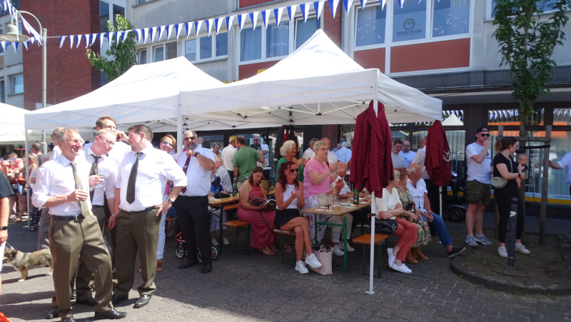 Die Bruderschaft feierte am Sonntag den Möschesonntag, mit dem sie das Schützenfest am kommenden Wochenende ankündigt. Nach der Totenehrung am Ehrenmal auf der Drupnas wurde auf dem Parkplatz an der Speestraße Mitten im Dorf bei viel Musik gemeinsam mit den Lintorfern gefeiert.