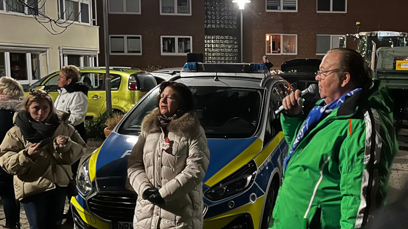 Nach einer kurzen Ansprache von Johannes Paas, dem Organisator der Lichterfahrt, sang Heinz Hülshoff zusammen mit vielen anwesenden Kindern, Weihnachtslieder. Die Bewohner und Mitarbeiter verfolgten dabei alles von den Fenstern. „Ihr Kinder singt richtig klasse, das kann man von den Schützen leider nicht sagen!“ so Hülshoff. „Es fehlt bei uns an Textsicherheit, daran müssen wir bis zum nächsten Jahr arbeiten“ erwiderte der Schützenchef.