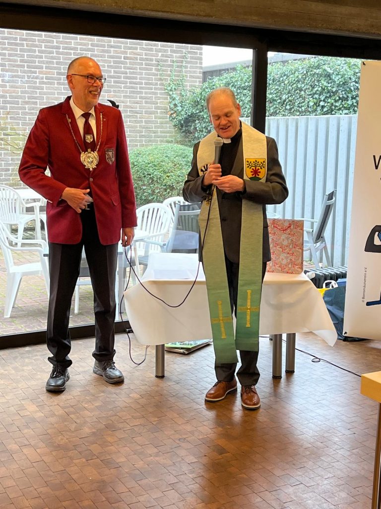 Ein weiterer bewegender Moment galt Präses Pastor Benedikt Zervosen. Nach der Zusammenlegung der Gemeinden Hösel/Breitscheid und Lintorf zur Gemeinde St. Anna im Jahr 2006 hatte er das Amt des leitenden Pfarrers übernommen und wurde damit auch Präses der Bruderschaft. In seiner Laudatio würdigte Kellersmann besonders das zunehmende Engagement des Präses für die Gemeinschaft. Als Zeichen der Dankbarkeit überreichten Frank Bensberg und Vertreter der Bruderschaft eine in der Abtei Mariendonk handgefertigte Stola. Die linke Seite zeigt das Wappen von Lintorf, die rechte den heiligen Sebastianus mit dem Pfeilkreuz der Schützen. Sichtlich gerührt bedankte sich Pastor Zervosen und erklärte, dass er zwar mit einer Aufmerksamkeit gerechnet habe, jedoch niemals mit einem derart kostbaren Geschenk.
