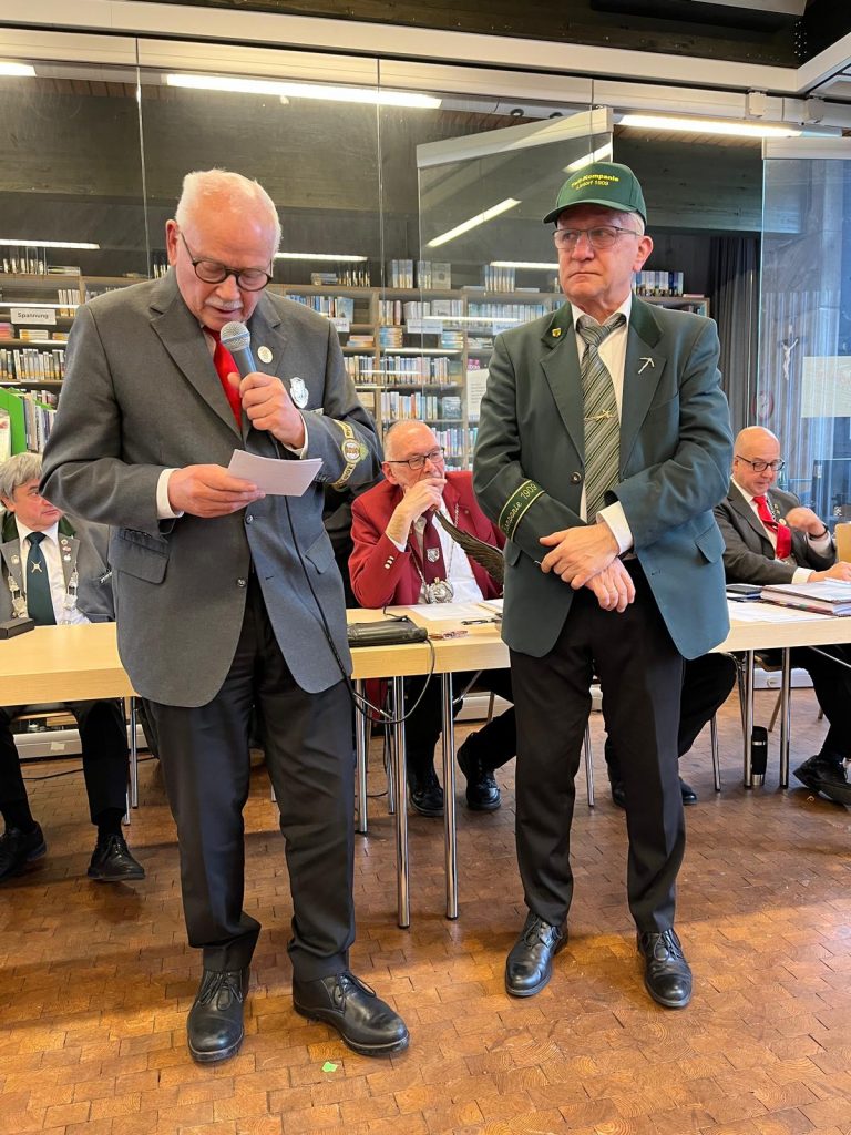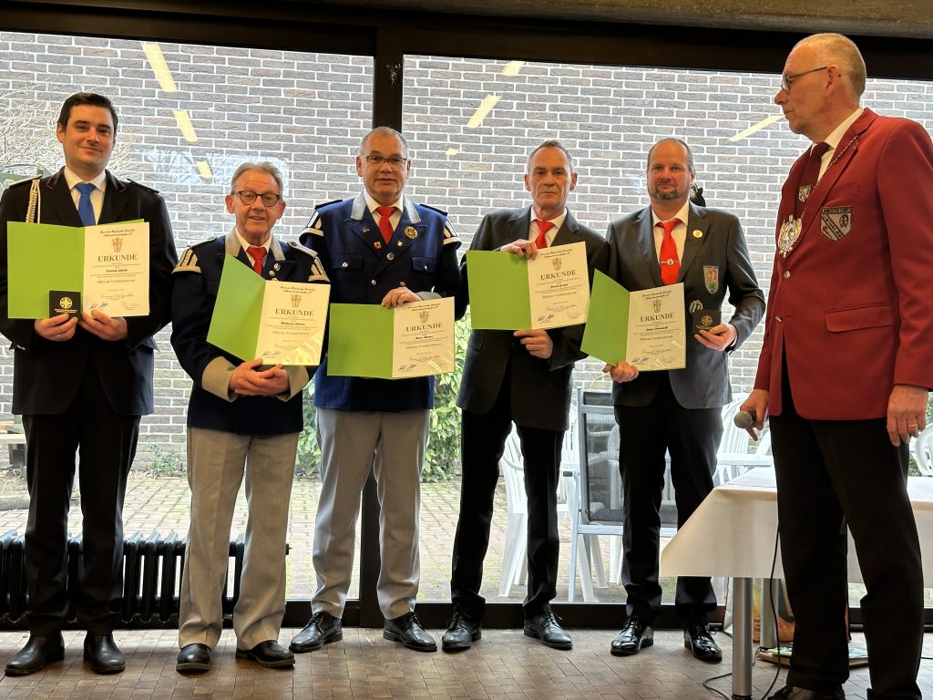 Einen besonders emotionalen Höhepunkt erlebte die Versammlung bei den Ehrungen verdienter Schützen. Mit den Worten „Ich rufe einen kleinen Mann auf, der immer mit einer großen Fahne durch das Dorf rennt“, leitete Kellersmann schmunzelnd die Laudatio ein. Als schließlich der Name „Iggi“ fiel, erhoben sich alle Anwesenden spontan von ihren Plätzen und spendeten Thomas „Iggi“ Pützer langanhaltenden Applaus. Bezirksbundesmeister Bernd Schäfkes verlas die Ernennungsurkunde und überreichte ihm den Hohen Bruderschaftsorden des Bundes der Historischen Deutschen Schützenbruderschaften – eine besondere Auszeichnung für jahrzehntelanges, unermüdliches Engagement.