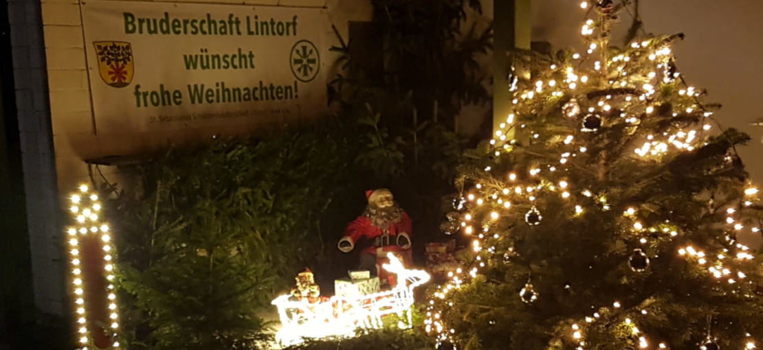 Im vergangenen Jahr hatte Platzmeister Willy Schnitzer einen kleinen Tannenbaum mit Lichtern im Schießstand auf dem Schützenplatz aufgestellt. In diesem Jahr ist der Weihnachtsschmuck etwas umfangreicher. Neben dem geschmückten Baum stehen noch mehrere kleine, ein Weihnachtsmann sitzt inmitten der Tannen auf seinem Schlitten. Von einem Banner wünscht die Bruderschaft frohe Weihnachten.